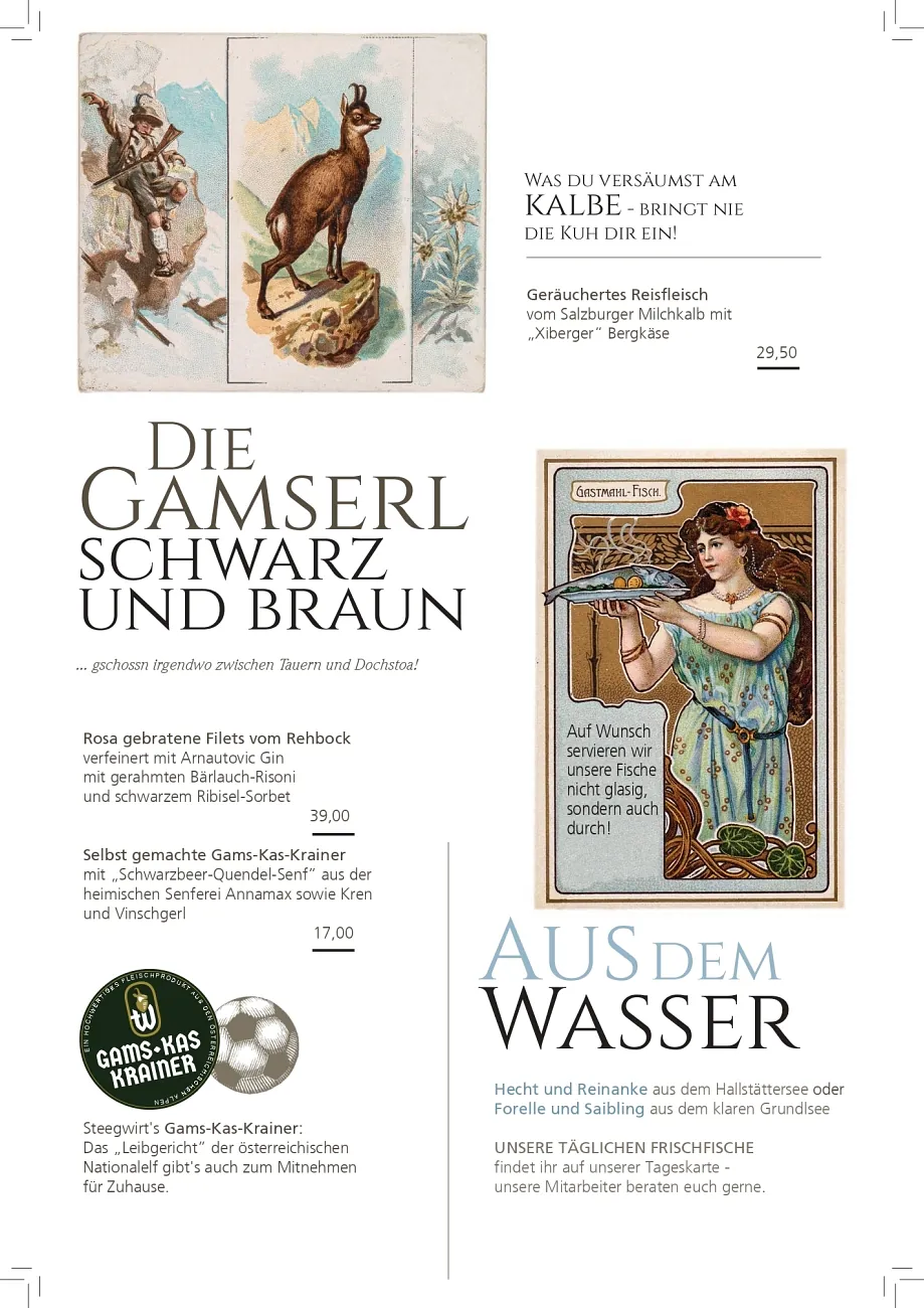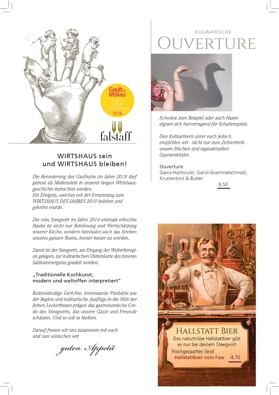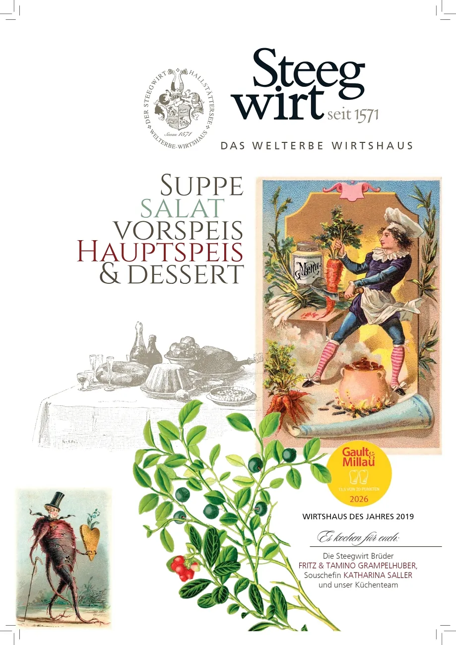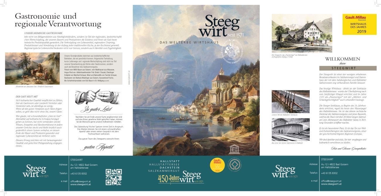 Beim Steegwirt erleben Sie gehobene Gastronomie bei ansprechendem Ambiente vor der Kulisse der Welterberegion Hallstatt – Dachstein – Salzkammergut. Traditionelle Rezepte, modern interpretiert und in Perfektion aus regionalen Ingredienzien ausgeführt: Begeben Sie sich bei uns auf eine kulinarische Entdeckungsreise und probieren Sie unsere sorgsam zubereiteten und liebevoll angerichteten Köstlichkeiten!
